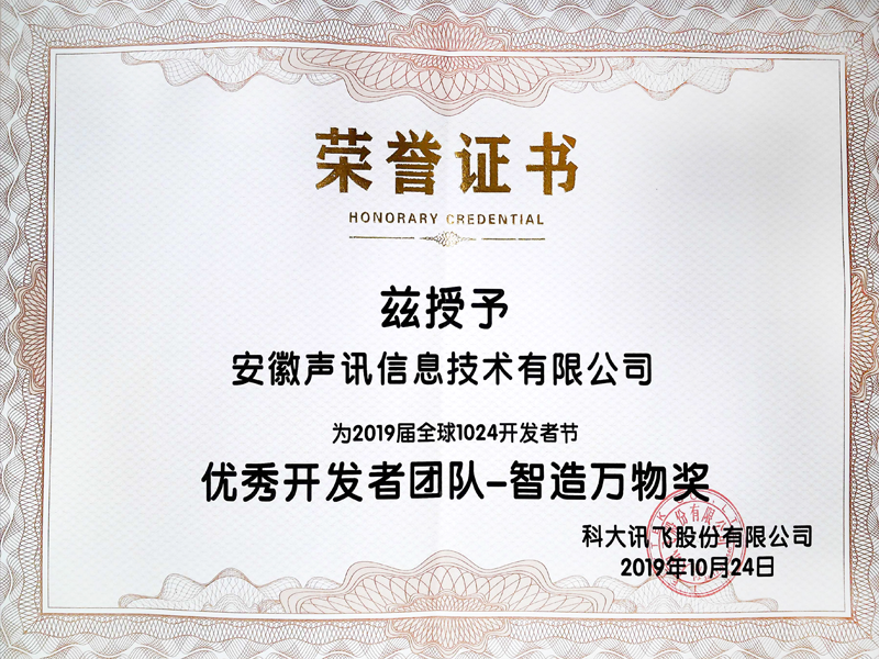 荣获科大讯飞合作伙伴优秀开发团队智造万物奖