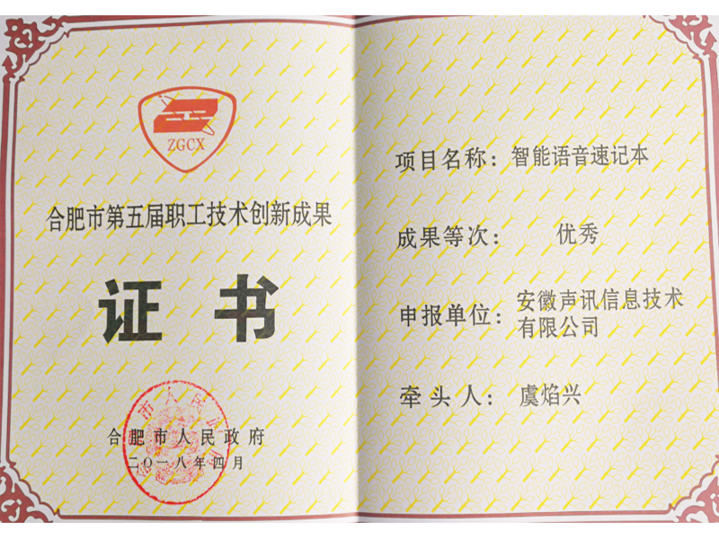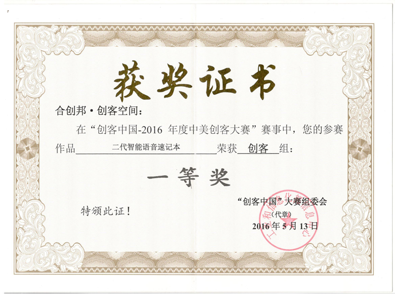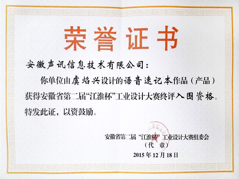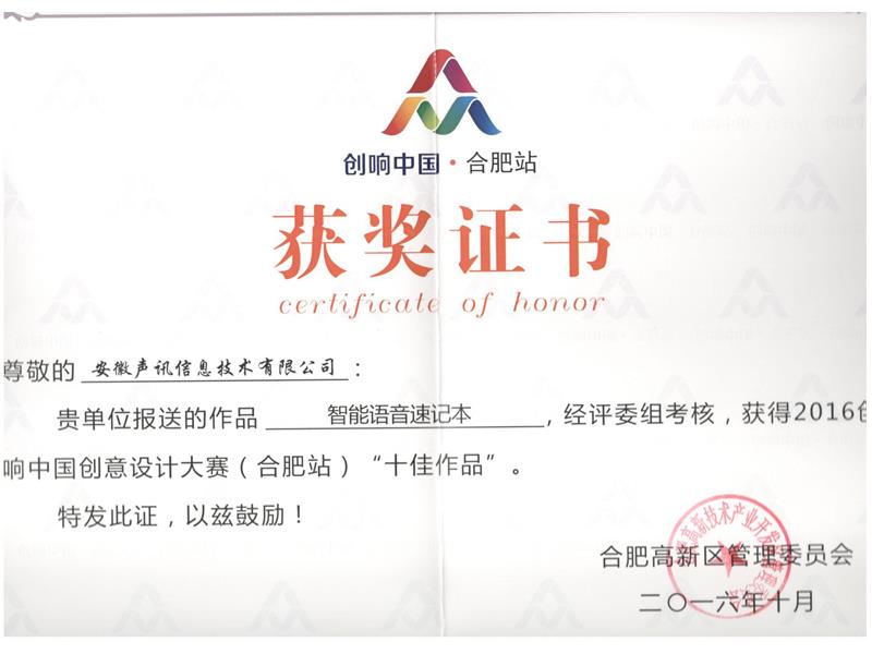 智能语音速记本荣获合肥市第五届职工技术创新成果优秀奖201841 合肥高新区创新创业奖20170120 智能会议速记机车库杯第二节智能家电创新大赛二等奖201711 智能语音速记本荣获第十九届中国国际高新技术成果交易会优秀产品奖201711 智能会议速记机或安徽省第四届工业设计大赛终评入围资格2017121 智能语音加密芯片荣获2017创客中国创新创业大赛100强20170926 智能语音加密芯片荣获2017创客中国智慧芯片设计与应用创新创业大赛三等奖20170924 创客大赛一等奖20160513 智能语音速记本荣获2016第二届安徽创业之星优秀项目2016121 创意大赛十佳作品奖201610 智能语音速记被评为安徽省第四批信息消费创新产品201607 声讯语音速记本荣获安徽省第二届“江淮杯”工业设计大赛入围资格20151218 浏览