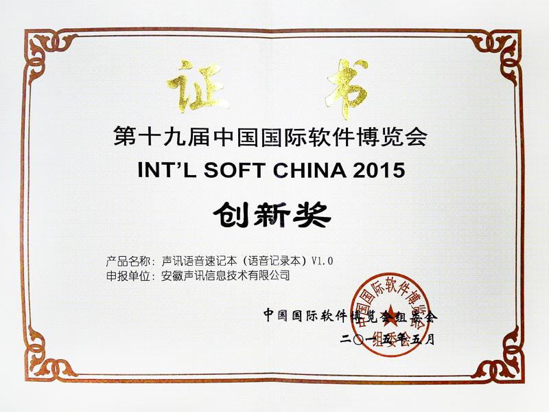 《声讯语音速记本》荣获第十九届中国国际软件博览会创新奖201505